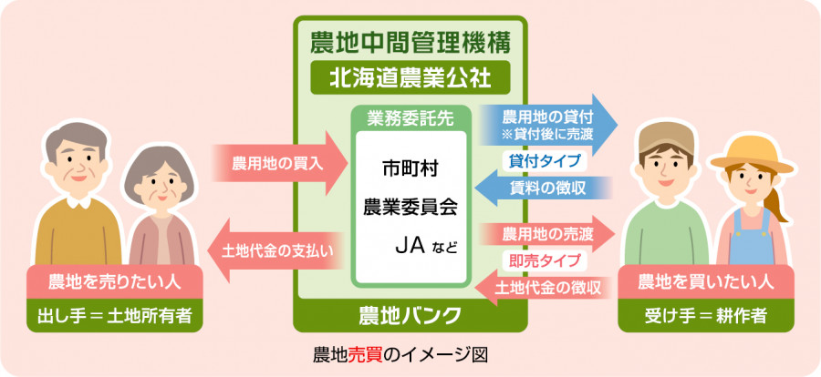北海道知事が指定した公的機関である「農地中間管理機構(農地バンク)」が、地域計画(目標地図)に位置付けられた受け手(耕作者)に対して、農地の権利(利用権・所有権)の設定や移転を行います。北海道では「北海道農業公社」がその指定を受けて実施しています。ア.農地を借りたい場合