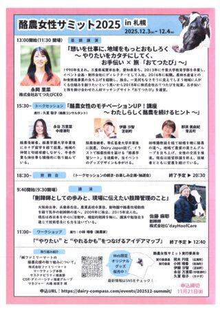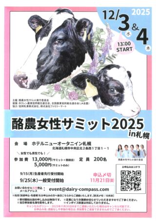 25.09.25 担い手センター 酪農女性サミット2025~開催のご案内~ 《サミット詳細》 https://dairy-compass.com/events/202512-summit/ 《サミットのグッズ》 https://suzuri.jp/dairy_woman_summit