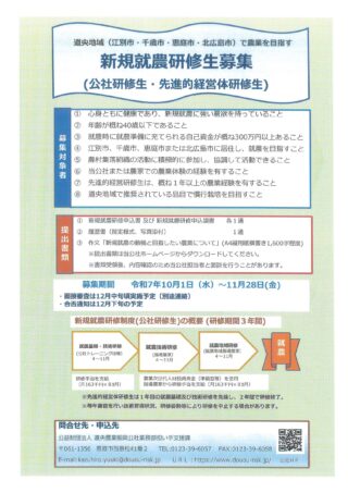 25.10.01 市町村等 【道央農業振興公社】令和8年度新規就農研修生の募集について 詳細は下記からご覧ください 募集要領.pdf 提出書類は下記からダウンロードしてください 研修申込書(公社研修生).docx 研修申込書(先進的経営体研修生).docx 履歴書.docx