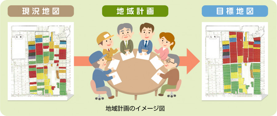 令和5年4月に農業経営基盤強化促進法等の改正によって「地域計画」が法制化され、全国の市町村が策定することになりました。「地域計画」は、将来の農地利用の姿を明確化した設計図で、概ね10年後を見据え「誰がどのように農地を使って農業を進めていくのか」を地域の話合いによりまとめた計画です。