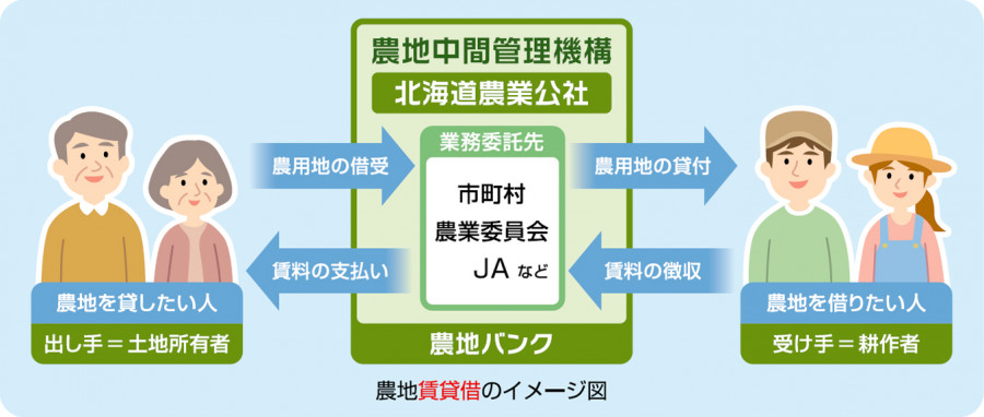 北海道知事が指定した公的機関である「農地中間管理機構(農地バンク)」が、地域計画(目標地図)に位置付けられた受け手(耕作者)に対して、農地の権利(利用権・所有権)の設定や移転を行います。北海道では「北海道農業公社」がその指定を受けて実施しています。ア.農地を借りたい場合