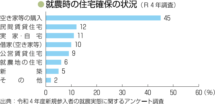 アンケート回答の2割が苦労した点に「住宅確保」をあげており、5割以上が「空き家」「就農地の住宅」「新築」など購入により確保していました。
